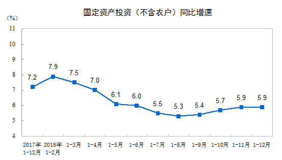 2018 年 1-12 月,全国固定资产投资(不含农户) 635636 亿元,比上年增长 5.9% ,增速与 1-11 月份持平,比上年同期回落 1.3 个百分点。从环比速度看, 12 月份固定资产投资(不含农户)增长 0.42% 。其中,民间固定资产投资 394051 亿元,比上年增长 8.7% ,增速比上年提高 2.7 个百分点。