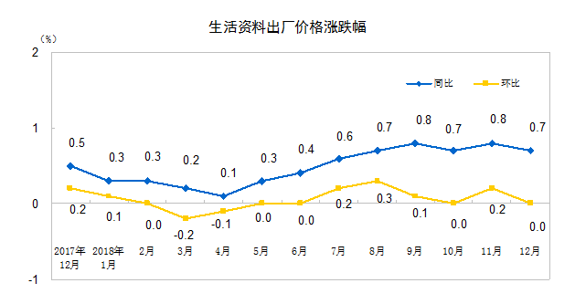 12 月份生产资料价格同比上涨 1.0% ,影响工业生产者出厂价格总水平上涨约 0.75 个百分点。其中,采掘工业价格上涨 3.8% ,原材料工业价格上涨 0.8% ,加工工业价格上涨 0.8% 。生活资料价格同比上涨 0.7% ,影响工业生产者出厂价格总水平上涨约 0.16 个百分点。其中,食品价格上涨 0.9% ,衣着价格上涨 1.6% ,一般日用品价格上涨 0.4% ,耐用消费品价格上涨 0.2% 。