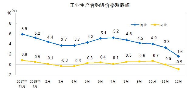 2018 年 12 月份,全国工业生产者出厂价格同比上涨 0.9% ,环比下降 1.0% ;工业生产者购进价格同比上涨 1.6% ,环比下降 0.9% 。全年工业生产者出厂价格比上年上涨 3.5% ,工业生产者购进价格上涨 4.1% 。