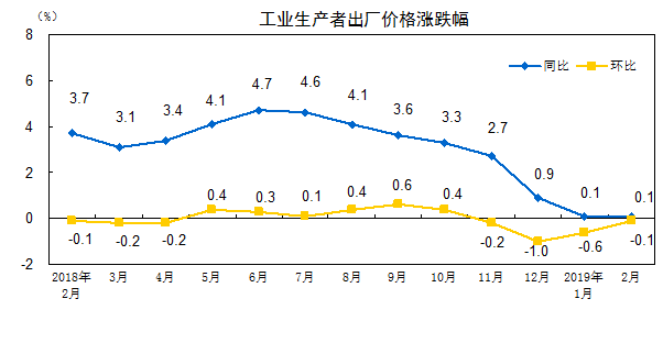 2019 年 2 月份,全国工业生产者出厂价格同比上涨 0.1% ,环比下降 0.1% ;工业生产者购进价格同比和环比均下降 0.1% 。 1 — 2 月平均,工业生产者出厂价格和购进价格均比去年同期上涨 0.1% 。