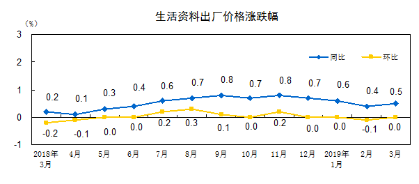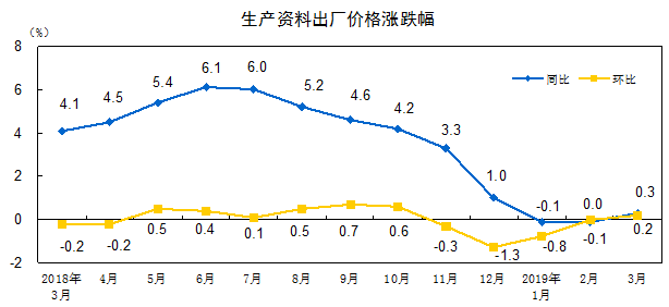 2019 年 3 月份,全国工业生产者出厂价格同比上涨 0.4% ,环比上涨 0.1% ;工业生产者购进价格同比上涨 0.2% ,环比持平。一季度,工业生产者出厂价格比去年同期上涨 0.2% ,工业生产者购进价格上涨 0.1% 。