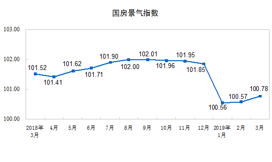 3 月份,房地产开发景气指数(简称“国房景气指数”)为 100.78 ,比 2 月份提高 0.21 点。